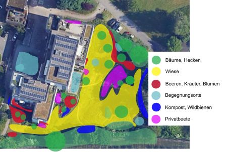 BG Aussenraum: Die BG gestaltet und unterhält die Flächen im Aussenraum mit dem Ziel, gleichzeitig einen Ort für Begegnung, Naturerlebnisse, gärtnerisches Experimentieren, Biodiversitätsförderung und Selbstversorgung zu schaffen.